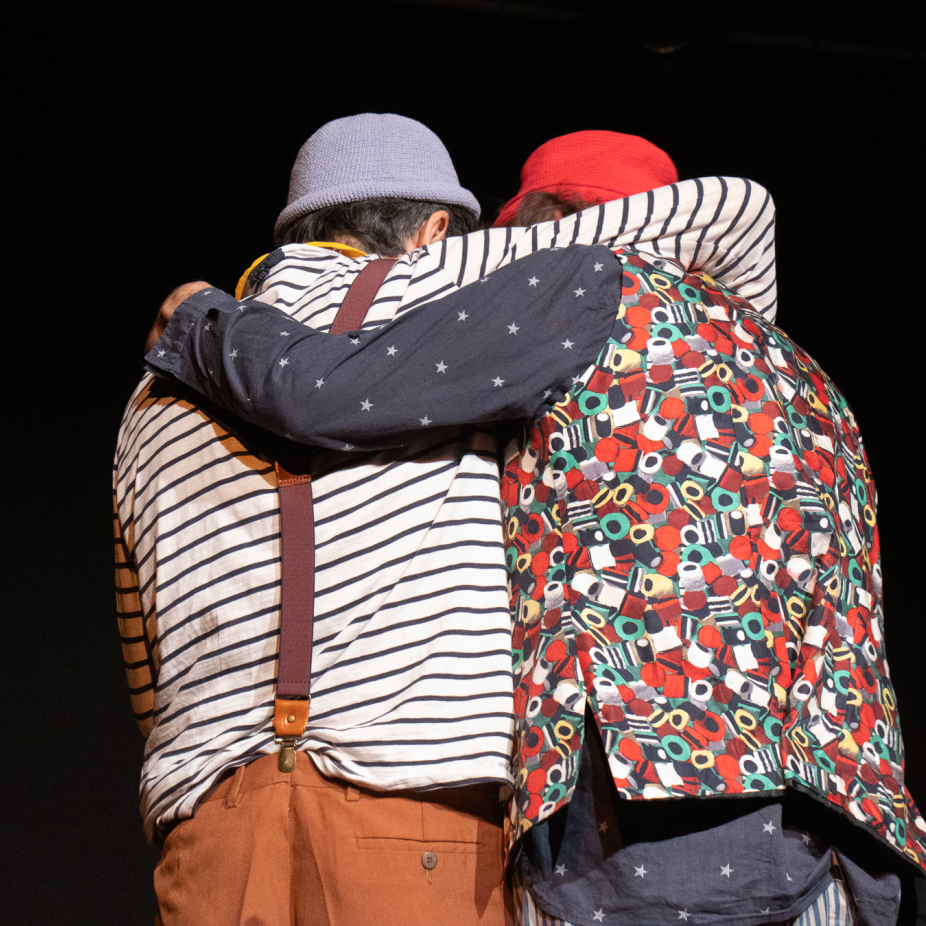 Amb l’Eduard Canimas viatgem entre teatre, música i improvisació, donant vida a dos personatges oposats: un que s’encongeix sota el judici i un altre que s’amaga darrere una seguretat de cartró pedra.